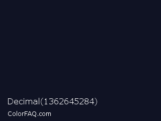 Decimal 1362645284 Color is a very dark blue color and the nearest color is Vulcan #10121d. Hex code #101324 and RGB value is rgb(16,19,36). In RGB color space, this color is composed of 6% red, 7% green, 14% blue, In CMYK color space, this color is composed of 56% cyan, 47% magenta, 0% yellow , 86% black , In HSL color space, this color has a hue angle of 231° , 38% saturation and 10% lightness.