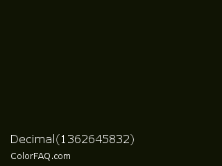 Decimal 1362645832 Color is a almost black lime color and the nearest color is Green Waterloo #101405. Hex code #101404 and RGB value is rgb(16,20,4). In RGB color space, this color is composed of 6% red, 8% green, 2% blue, In CMYK color space, this color is composed of 20% cyan, 0% magenta, 80% yellow , 92% black , In HSL color space, this color has a hue angle of 75° , 67% saturation and 5% lightness.