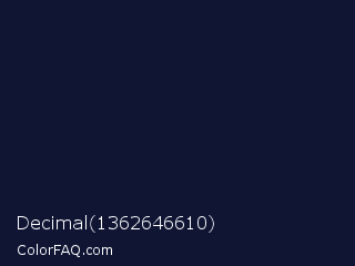 Decimal 1362646610 Color is a very dark blue color and the nearest color is Haiti #1b1035. Hex code #101534 and RGB value is rgb(16,21,52). In RGB color space, this color is composed of 6% red, 8% green, 20% blue, In CMYK color space, this color is composed of 69% cyan, 60% magenta, 0% yellow , 80% black , In HSL color space, this color has a hue angle of 232° , 53% saturation and 13% lightness.