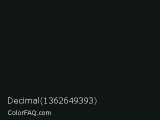 Decimal 1362649393 Color is a almost black green color and the nearest color is Racing Green #0c1911. Hex code #101713 and RGB value is rgb(16,23,19). In RGB color space, this color is composed of 6% red, 9% green, 7% blue, In CMYK color space, this color is composed of 30% cyan, 0% magenta, 17% yellow , 91% black , In HSL color space, this color has a hue angle of 146° , 18% saturation and 8% lightness.