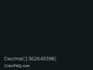 Decimal 1362649398 Color is a almost black cyan color and the nearest color is Aztec #0d1c19. Hex code #101718 and RGB value is rgb(16,23,24). In RGB color space, this color is composed of 6% red, 9% green, 9% blue, In CMYK color space, this color is composed of 33% cyan, 4% magenta, 0% yellow , 91% black , In HSL color space, this color has a hue angle of 188° , 20% saturation and 8% lightness.
