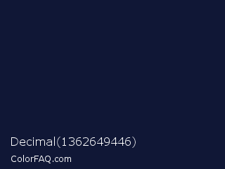 Decimal 1362649446 Color is a very dark blue color and the nearest color is Haiti #1b1035. Hex code #101736 and RGB value is rgb(16,23,54). In RGB color space, this color is composed of 6% red, 9% green, 21% blue, In CMYK color space, this color is composed of 70% cyan, 57% magenta, 0% yellow , 79% black , In HSL color space, this color has a hue angle of 229° , 54% saturation and 14% lightness.