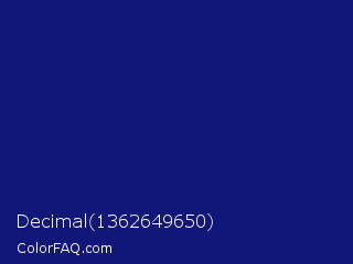 Decimal 1362649650 Color is a dark blue color and the nearest color is Midnight Blue #191970. Hex code #101778 and RGB value is rgb(16,23,120). In RGB color space, this color is composed of 6% red, 9% green, 47% blue, In CMYK color space, this color is composed of 87% cyan, 81% magenta, 0% yellow , 53% black , In HSL color space, this color has a hue angle of 236° , 76% saturation and 27% lightness.