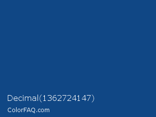Decimal 1362724147 Color is a dark blue color and the nearest color is Dark Cerulean #08457e. Hex code #104785 and RGB value is rgb(16,71,133). In RGB color space, this color is composed of 6% red, 28% green, 52% blue, In CMYK color space, this color is composed of 88% cyan, 47% magenta, 0% yellow , 48% black , In HSL color space, this color has a hue angle of 212° , 79% saturation and 29% lightness.