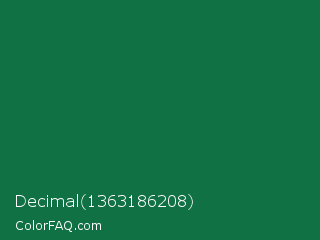 Decimal 1363186208 Color is a dark green color and the nearest color is Dark Spring Green #177245. Hex code #107144 and RGB value is rgb(16,113,68). In RGB color space, this color is composed of 6% red, 44% green, 27% blue, In CMYK color space, this color is composed of 86% cyan, 0% magenta, 40% yellow , 56% black , In HSL color space, this color has a hue angle of 152° , 75% saturation and 25% lightness.