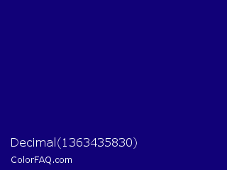 Decimal 1363435830 Color is a dark indigo color and the nearest color is Arapawa #110c6c. Hex code #110178 and RGB value is rgb(17,1,120). In RGB color space, this color is composed of 7% red, 0% green, 47% blue, In CMYK color space, this color is composed of 86% cyan, 99% magenta, 0% yellow , 53% black , In HSL color space, this color has a hue angle of 248° , 98% saturation and 24% lightness.