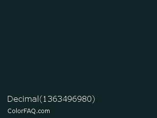 Decimal 1363496980 Color is a very dark cyan color and the nearest color is Dark Jungle Green #1a2421. Hex code #112426 and RGB value is rgb(17,36,38). In RGB color space, this color is composed of 7% red, 14% green, 15% blue, In CMYK color space, this color is composed of 55% cyan, 5% magenta, 0% yellow , 85% black , In HSL color space, this color has a hue angle of 186° , 38% saturation and 11% lightness.