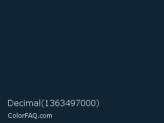 Decimal 1363497000 Color is a very dark blue color and the nearest color is Firefly #0e2a30. Hex code #112434 and RGB value is rgb(17,36,52). In RGB color space, this color is composed of 7% red, 14% green, 20% blue, In CMYK color space, this color is composed of 67% cyan, 31% magenta, 0% yellow , 80% black , In HSL color space, this color has a hue angle of 207° , 51% saturation and 14% lightness.