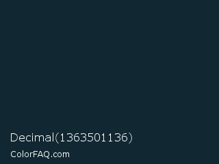 Decimal 1363501136 Color is a very dark blue color and the nearest color is Firefly #0e2a30. Hex code #112832 and RGB value is rgb(17,40,50). In RGB color space, this color is composed of 7% red, 16% green, 20% blue, In CMYK color space, this color is composed of 66% cyan, 20% magenta, 0% yellow , 80% black , In HSL color space, this color has a hue angle of 198° , 49% saturation and 13% lightness.