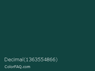 Decimal 1363554866 Color is a very dark cyan color and the nearest color is MSU Green #18453b. Hex code #114440 and RGB value is rgb(17,68,64). In RGB color space, this color is composed of 7% red, 27% green, 25% blue, In CMYK color space, this color is composed of 75% cyan, 0% magenta, 6% yellow , 73% black , In HSL color space, this color has a hue angle of 175° , 60% saturation and 17% lightness.