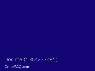 Decimal 1364273481 Color is a dark indigo color and the nearest color is Arapawa #110c6c. Hex code #120675 and RGB value is rgb(18,6,117). In RGB color space, this color is composed of 7% red, 2% green, 46% blue, In CMYK color space, this color is composed of 85% cyan, 95% magenta, 0% yellow , 54% black , In HSL color space, this color has a hue angle of 246° , 90% saturation and 24% lightness.