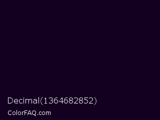 Decimal 1364682852 Color is a almost black purple color and the nearest color is Black Russian #0a001c. Hex code #130020 and RGB value is rgb(19,0,32). In RGB color space, this color is composed of 7% red, 0% green, 13% blue, In CMYK color space, this color is composed of 41% cyan, 100% magenta, 0% yellow , 87% black , In HSL color space, this color has a hue angle of 276° , 100% saturation and 6% lightness.