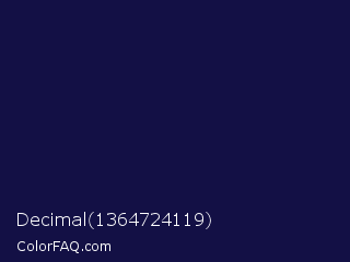 Decimal 1364724119 Color is a very dark indigo color and the nearest color is Deep Cove #051040. Hex code #131045 and RGB value is rgb(19,16,69). In RGB color space, this color is composed of 7% red, 6% green, 27% blue, In CMYK color space, this color is composed of 72% cyan, 77% magenta, 0% yellow , 73% black , In HSL color space, this color has a hue angle of 243° , 62% saturation and 17% lightness.