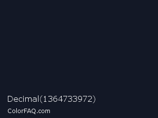 Decimal 1364733972 Color is a very dark blue color and the nearest color is Mirage #161928. Hex code #131826 and RGB value is rgb(19,24,38). In RGB color space, this color is composed of 7% red, 9% green, 15% blue, In CMYK color space, this color is composed of 50% cyan, 37% magenta, 0% yellow , 85% black , In HSL color space, this color has a hue angle of 224° , 33% saturation and 11% lightness.