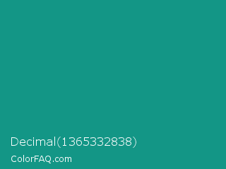 Decimal 1365332838 Color is a normal cyan color and the nearest color is Gossamer #069b81. Hex code #139686 and RGB value is rgb(19,150,134). In RGB color space, this color is composed of 7% red, 59% green, 53% blue, In CMYK color space, this color is composed of 87% cyan, 0% magenta, 11% yellow , 41% black , In HSL color space, this color has a hue angle of 173° , 78% saturation and 33% lightness.