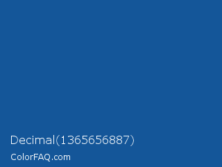 Decimal 1365656887 Color is a normal blue color and the nearest color is Yale Blue #0f4d92. Hex code #145699 and RGB value is rgb(20,86,153). In RGB color space, this color is composed of 8% red, 34% green, 60% blue, In CMYK color space, this color is composed of 87% cyan, 44% magenta, 0% yellow , 40% black , In HSL color space, this color has a hue angle of 210° , 77% saturation and 34% lightness.