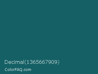 Decimal 1365667909 Color is a dark cyan color and the nearest color is Deep Sea Green #095859. Hex code #146065 and RGB value is rgb(20,96,101). In RGB color space, this color is composed of 8% red, 38% green, 40% blue, In CMYK color space, this color is composed of 80% cyan, 5% magenta, 0% yellow , 60% black , In HSL color space, this color has a hue angle of 184° , 67% saturation and 24% lightness.