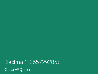 Decimal 1365729285 Color is a dark cyan color and the nearest color is Deep Green Cyan Turquoise #0e7c61. Hex code #148365 and RGB value is rgb(20,131,101). In RGB color space, this color is composed of 8% red, 51% green, 40% blue, In CMYK color space, this color is composed of 85% cyan, 0% magenta, 23% yellow , 49% black , In HSL color space, this color has a hue angle of 164° , 74% saturation and 30% lightness.