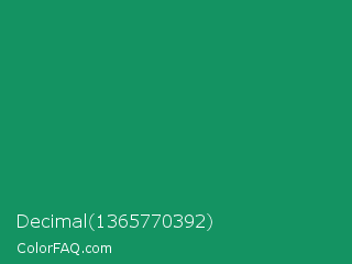 Decimal 1365770392 Color is a normal green color and the nearest color is Green Cyan #009966. Hex code #149362 and RGB value is rgb(20,147,98). In RGB color space, this color is composed of 8% red, 58% green, 38% blue, In CMYK color space, this color is composed of 86% cyan, 0% magenta, 33% yellow , 42% black , In HSL color space, this color has a hue angle of 157° , 76% saturation and 33% lightness.