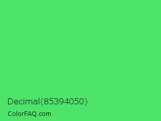 Decimal 85394050 Color is a normal green color and the nearest color is UFO Green #3cd070. Hex code #4ee46a and RGB value is rgb(78,228,106). In RGB color space, this color is composed of 31% red, 89% green, 42% blue, In CMYK color space, this color is composed of 66% cyan, 0% magenta, 54% yellow , 11% black , In HSL color space, this color has a hue angle of 131° , 74% saturation and 60% lightness.
