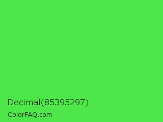 Decimal 85395297 Color is a normal green color and the nearest color is Lime Green #32cd32. Hex code #4ee649 and RGB value is rgb(78,230,73). In RGB color space, this color is composed of 31% red, 90% green, 29% blue, In CMYK color space, this color is composed of 66% cyan, 0% magenta, 68% yellow , 10% black , In HSL color space, this color has a hue angle of 118° , 76% saturation and 59% lightness.