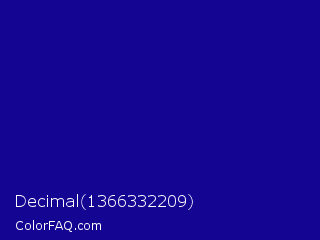 Decimal 1366332209 Color is a dark indigo color and the nearest color is Ultramarine #120a8f. Hex code #150593 and RGB value is rgb(21,5,147). In RGB color space, this color is composed of 8% red, 2% green, 58% blue, In CMYK color space, this color is composed of 86% cyan, 97% magenta, 0% yellow , 42% black , In HSL color space, this color has a hue angle of 247° , 93% saturation and 30% lightness.