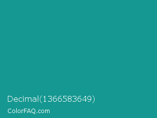 Decimal 1366583649 Color is a normal cyan color and the nearest color is Blue Chill #0c8990. Hex code #159891 and RGB value is rgb(21,152,145). In RGB color space, this color is composed of 8% red, 60% green, 57% blue, In CMYK color space, this color is composed of 86% cyan, 0% magenta, 5% yellow , 40% black , In HSL color space, this color has a hue angle of 177° , 76% saturation and 34% lightness.