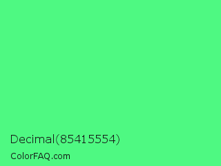 Decimal 85415554 Color is a light green color and the nearest color is Very Light Malachite Green #64e986. Hex code #4ef982 and RGB value is rgb(78,249,130). In RGB color space, this color is composed of 31% red, 98% green, 51% blue, In CMYK color space, this color is composed of 69% cyan, 0% magenta, 48% yellow , 2% black , In HSL color space, this color has a hue angle of 138° , 93% saturation and 64% lightness.