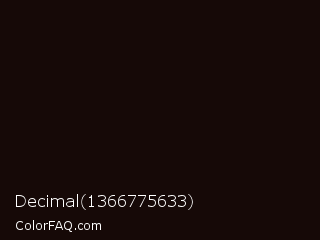 Decimal 1366775633 Color is a almost black red color and the nearest color is Asphalt #130a06. Hex code #160907 and RGB value is rgb(22,9,7). In RGB color space, this color is composed of 9% red, 4% green, 3% blue, In CMYK color space, this color is composed of 0% cyan, 59% magenta, 68% yellow , 91% black , In HSL color space, this color has a hue angle of 8° , 52% saturation and 6% lightness.