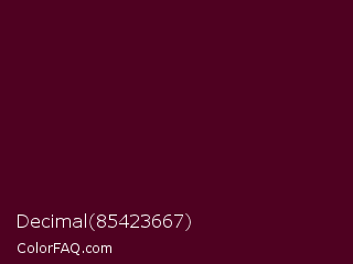 Decimal 85423667 Color is a very dark rose color and the nearest color is Castro #52001f. Hex code #4f0121 and RGB value is rgb(79,1,33). In RGB color space, this color is composed of 31% red, 0% green, 13% blue, In CMYK color space, this color is composed of 0% cyan, 99% magenta, 58% yellow , 69% black , In HSL color space, this color has a hue angle of 335° , 98% saturation and 16% lightness.
