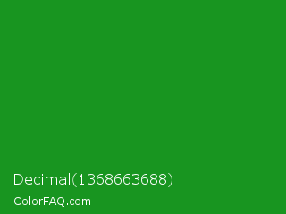 Decimal 1368663688 Color is a normal green color and the nearest color is Forest Green #228b22. Hex code #189520 and RGB value is rgb(24,149,32). In RGB color space, this color is composed of 9% red, 58% green, 13% blue, In CMYK color space, this color is composed of 84% cyan, 0% magenta, 79% yellow , 42% black , In HSL color space, this color has a hue angle of 124° , 72% saturation and 34% lightness.