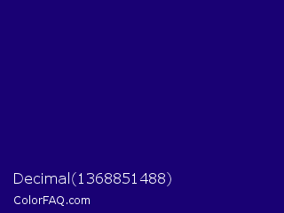 Decimal 1368851488 Color is a dark indigo color and the nearest color is Deep Blue #220878. Hex code #190174 and RGB value is rgb(25,1,116). In RGB color space, this color is composed of 10% red, 0% green, 45% blue, In CMYK color space, this color is composed of 78% cyan, 99% magenta, 0% yellow , 55% black , In HSL color space, this color has a hue angle of 253° , 98% saturation and 23% lightness.