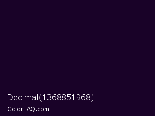 Decimal 1368851968 Color is a almost black purple color and the nearest color is Black Rock #0d0332. Hex code #190228 and RGB value is rgb(25,2,40). In RGB color space, this color is composed of 10% red, 1% green, 16% blue, In CMYK color space, this color is composed of 38% cyan, 95% magenta, 0% yellow , 84% black , In HSL color space, this color has a hue angle of 276° , 90% saturation and 8% lightness.