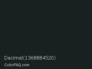 Decimal 1368884520 Color is a very dark cyan color and the nearest color is Dark Jungle Green #1a2421. Hex code #192120 and RGB value is rgb(25,33,32). In RGB color space, this color is composed of 10% red, 13% green, 13% blue, In CMYK color space, this color is composed of 24% cyan, 0% magenta, 3% yellow , 87% black , In HSL color space, this color has a hue angle of 173° , 14% saturation and 11% lightness.