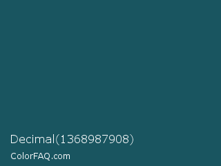Decimal 1368987908 Color is a dark cyan color and the nearest color is Eden #105852. Hex code #195560 and RGB value is rgb(25,85,96). In RGB color space, this color is composed of 10% red, 33% green, 38% blue, In CMYK color space, this color is composed of 74% cyan, 11% magenta, 0% yellow , 62% black , In HSL color space, this color has a hue angle of 189° , 59% saturation and 24% lightness.