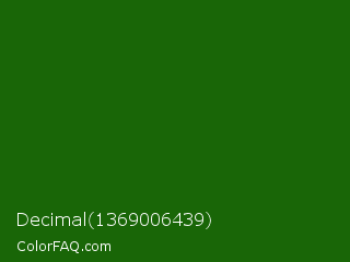 Decimal 1369006439 Color is a very dark green color and the nearest color is Lincoln Green #195905. Hex code #196607 and RGB value is rgb(25,102,7). In RGB color space, this color is composed of 10% red, 40% green, 3% blue, In CMYK color space, this color is composed of 75% cyan, 0% magenta, 93% yellow , 60% black , In HSL color space, this color has a hue angle of 109° , 87% saturation and 21% lightness.
