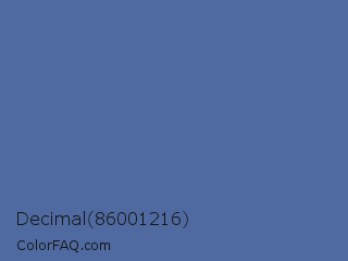 Decimal 86001216 Color is a normal blue color and the nearest color is Blue Yonder #5072a7. Hex code #4f6aa0 and RGB value is rgb(79,106,160). In RGB color space, this color is composed of 31% red, 42% green, 63% blue, In CMYK color space, this color is composed of 51% cyan, 34% magenta, 0% yellow , 37% black , In HSL color space, this color has a hue angle of 220° , 34% saturation and 47% lightness.