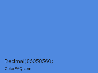 Decimal 86058560 Color is a normal blue color and the nearest color is Havelock Blue #5590d9. Hex code #4f89e0 and RGB value is rgb(79,137,224). In RGB color space, this color is composed of 31% red, 54% green, 88% blue, In CMYK color space, this color is composed of 65% cyan, 39% magenta, 0% yellow , 12% black , In HSL color space, this color has a hue angle of 216° , 70% saturation and 59% lightness.