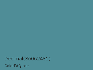 Decimal 86062481 Color is a normal cyan color and the nearest color is Smalt Blue #51808f. Hex code #4f8d97 and RGB value is rgb(79,141,151). In RGB color space, this color is composed of 31% red, 55% green, 59% blue, In CMYK color space, this color is composed of 48% cyan, 7% magenta, 0% yellow , 41% black , In HSL color space, this color has a hue angle of 188° , 31% saturation and 45% lightness.