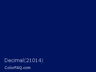 Decimal 21014 Color is a very dark blue color and the nearest color is Gulf Blue #051657. Hex code #001460 and RGB value is rgb(0,20,96). In RGB color space, this color is composed of 0% red, 8% green, 38% blue, In CMYK color space, this color is composed of 100% cyan, 79% magenta, 0% yellow , 62% black , In HSL color space, this color has a hue angle of 228° , 100% saturation and 19% lightness.