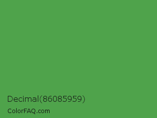 Decimal 86085959 Color is a normal green color and the nearest color is Apple #4fa83d. Hex code #4fa34b and RGB value is rgb(79,163,75). In RGB color space, this color is composed of 31% red, 64% green, 29% blue, In CMYK color space, this color is composed of 52% cyan, 0% magenta, 54% yellow , 36% black , In HSL color space, this color has a hue angle of 117° , 37% saturation and 47% lightness.