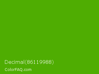 Decimal 86119988 Color is a normal green color and the nearest color is Kelly Green #4cbb17. Hex code #4fad02 and RGB value is rgb(79,173,2). In RGB color space, this color is composed of 31% red, 68% green, 1% blue, In CMYK color space, this color is composed of 54% cyan, 0% magenta, 99% yellow , 32% black , In HSL color space, this color has a hue angle of 93° , 98% saturation and 34% lightness.