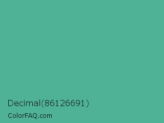Decimal 86126691 Color is a normal cyan color and the nearest color is Ocean Green #48bf91. Hex code #4fb297 and RGB value is rgb(79,178,151). In RGB color space, this color is composed of 31% red, 70% green, 59% blue, In CMYK color space, this color is composed of 56% cyan, 0% magenta, 15% yellow , 30% black , In HSL color space, this color has a hue angle of 164° , 39% saturation and 50% lightness.