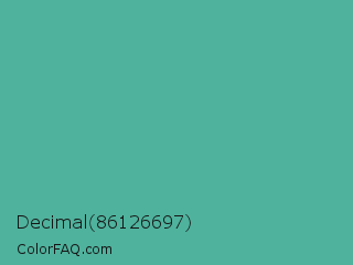 Decimal 86126697 Color is a normal cyan color and the nearest color is Ocean Green #48bf91. Hex code #4fb29d and RGB value is rgb(79,178,157). In RGB color space, this color is composed of 31% red, 70% green, 62% blue, In CMYK color space, this color is composed of 56% cyan, 0% magenta, 12% yellow , 30% black , In HSL color space, this color has a hue angle of 167° , 39% saturation and 50% lightness.