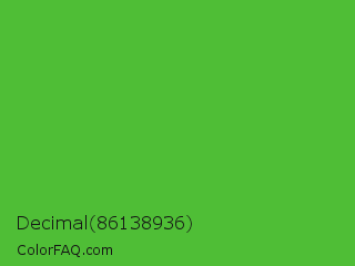 Decimal 86138936 Color is a normal green color and the nearest color is Apple #4fa83d. Hex code #4fbe36 and RGB value is rgb(79,190,54). In RGB color space, this color is composed of 31% red, 75% green, 21% blue, In CMYK color space, this color is composed of 58% cyan, 0% magenta, 72% yellow , 25% black , In HSL color space, this color has a hue angle of 109° , 56% saturation and 48% lightness.