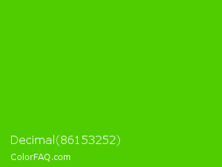 Decimal 86153252 Color is a normal green color and the nearest color is Harlequin Green #46cb18. Hex code #4fcd00 and RGB value is rgb(79,205,0). In RGB color space, this color is composed of 31% red, 80% green, 0% blue, In CMYK color space, this color is composed of 61% cyan, 0% magenta, 100% yellow , 20% black , In HSL color space, this color has a hue angle of 97° , 100% saturation and 40% lightness.