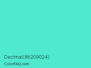 Decimal 86209024 Color is a light cyan color and the nearest color is Turquoise #40e0d0. Hex code #4fe9d0 and RGB value is rgb(79,233,208). In RGB color space, this color is composed of 31% red, 91% green, 82% blue, In CMYK color space, this color is composed of 66% cyan, 0% magenta, 11% yellow , 9% black , In HSL color space, this color has a hue angle of 170° , 78% saturation and 61% lightness.