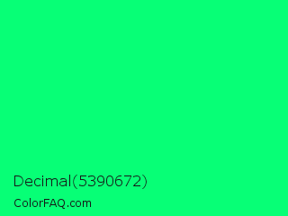 Decimal 5390672 Color is a normal green color and the nearest color is Spring Green #00ff7f. Hex code #07ff76 and RGB value is rgb(7,255,118). In RGB color space, this color is composed of 3% red, 100% green, 46% blue, In CMYK color space, this color is composed of 97% cyan, 0% magenta, 54% yellow , 0% black , In HSL color space, this color has a hue angle of 147° , 100% saturation and 51% lightness.