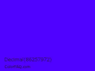 Decimal 86257972 Color is a normal indigo color and the nearest color is Electric Ultramarine #3f00ff. Hex code #5000fe and RGB value is rgb(80,0,254). In RGB color space, this color is composed of 31% red, 0% green, 100% blue, In CMYK color space, this color is composed of 69% cyan, 100% magenta, 0% yellow , 0% black , In HSL color space, this color has a hue angle of 259° , 100% saturation and 50% lightness.