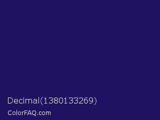 Decimal 1380133269 Color is a dark indigo color and the nearest color is Violent Violet #290c5e. Hex code #201063 and RGB value is rgb(32,16,99). In RGB color space, this color is composed of 13% red, 6% green, 39% blue, In CMYK color space, this color is composed of 68% cyan, 84% magenta, 0% yellow , 61% black , In HSL color space, this color has a hue angle of 252° , 72% saturation and 23% lightness.